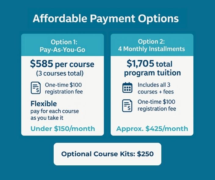 - $1,705 total program tuition (includes all 3 courses + fees)